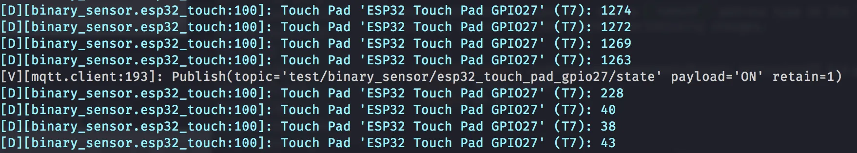 Upload the program/configuration and watch the device’s logs; you’ll see values being logged by the hub component. Touching the sensor’s pins/pads should result in a (significant) change in the values being logged. Experiment with different amounts of force applied to the touch pad; a pattern should emerge, revealing a value that falls between “touched” and “not touched” which the binary sensor will then use to differentiate between the two states.