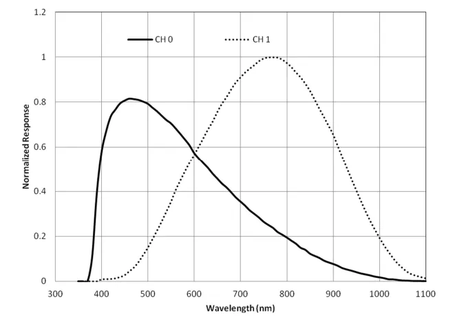 The devices consist of two photodiodes: The CH0 diode is sensitive to both visible and infrared light and the CH1 diode is sensitive only to infrared light.
