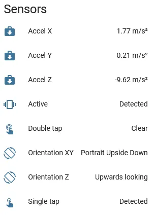 This component provides acceleration data in m/s², orientation information, and tap detection. XYZ axes can be calibrated and transformed to match the physical orientation of the sensor.